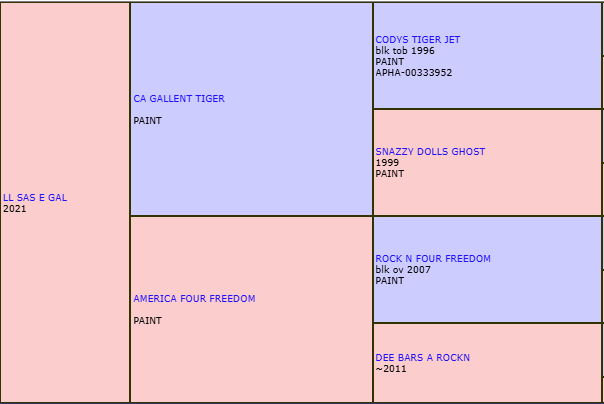 LL Sas E Gal (Splashy) is homozygous black and carrys a splash gene as well. She comes from Laura Lee & LeArda McKenny’s program. She is currently open and will be bred to Sippin Stoli in 2025. New pictures to come this summer.